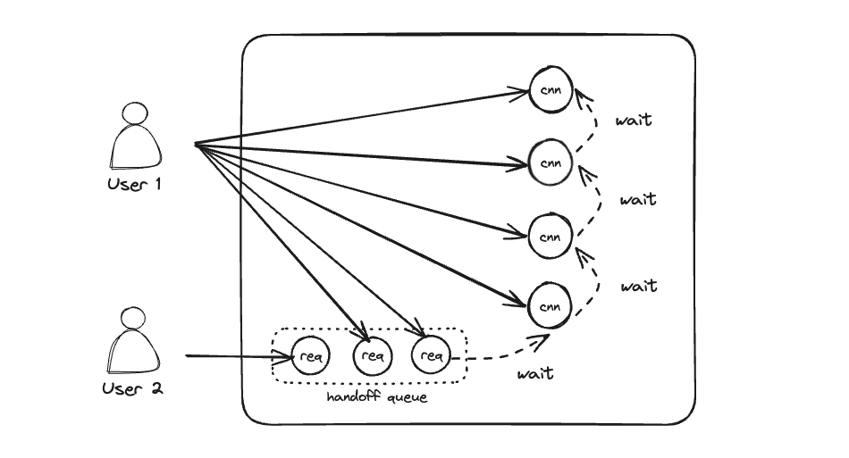 위 그림처럼 조회시 락으로 커넥션이 모두 점유된다면, 스레드는 HandOffQueue 를 Polling 커넥션을 획득하기 위한 대기가 필요해진다. 한 사용자가 CP를 독점한다면 결국 다른 사용자들도 커넥션을 독점한 사용자의 요청이 순차 처리되길 기다리는 상황이 발생하는 것이다.