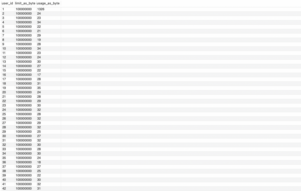 update storage_usage set limit_as_byte=100, usage_as_byte=28 where user_id=1;