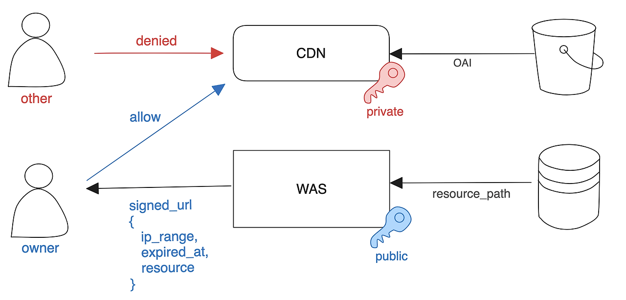 사용자 사진, 동영상 파일을 S3에 저장하고 이를 CDN에 캐시하여 자원을 반환한다. 이 구조에서 악성 유저가 CDN URL의 resource key를 brute force로 요청하여 타인의 자원을 확인할 수 있는 문제가 있다. 유효 기간 동안만, 인증된 사용자만 자원을 허락할 수 있도록 개선하고자 한다.