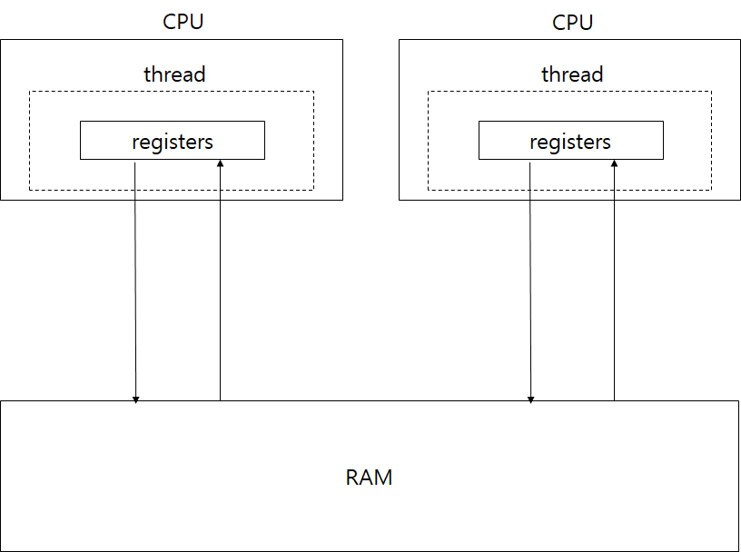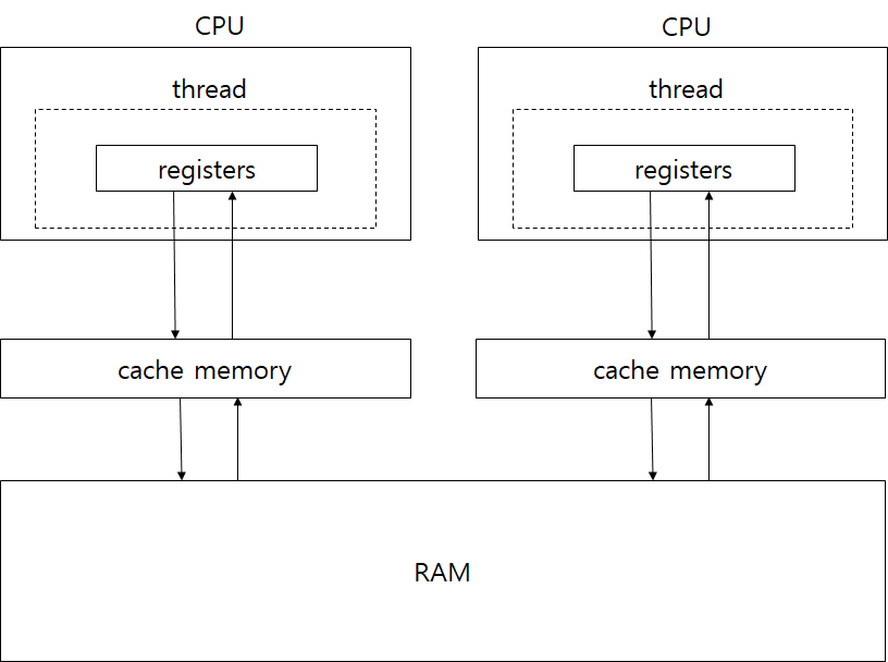 한 스레드가 변경된 값을 cache memory에서 ram에 데이터를 저장하기 전, 다른 스레드에서 Ram에서 해당 값을 읽어 변경되기 이전의 값을 처리하게 되는 상황을 가시성이 보장되지 않는다 라고 말한다.