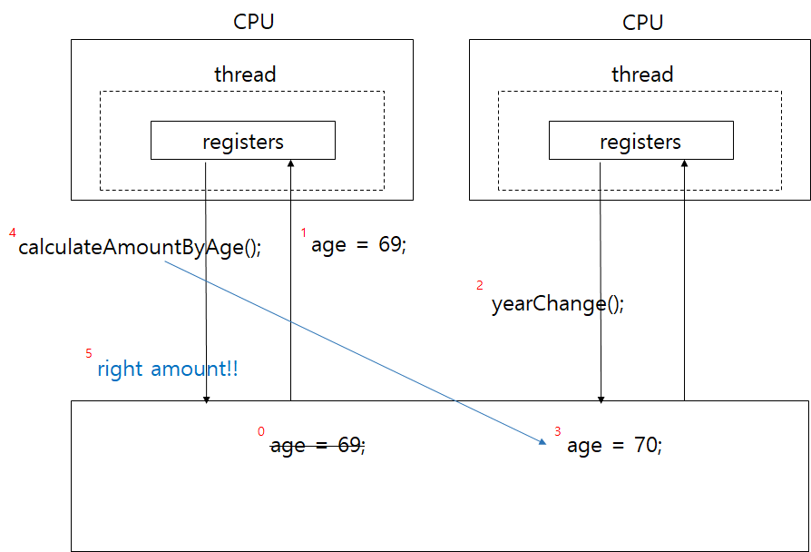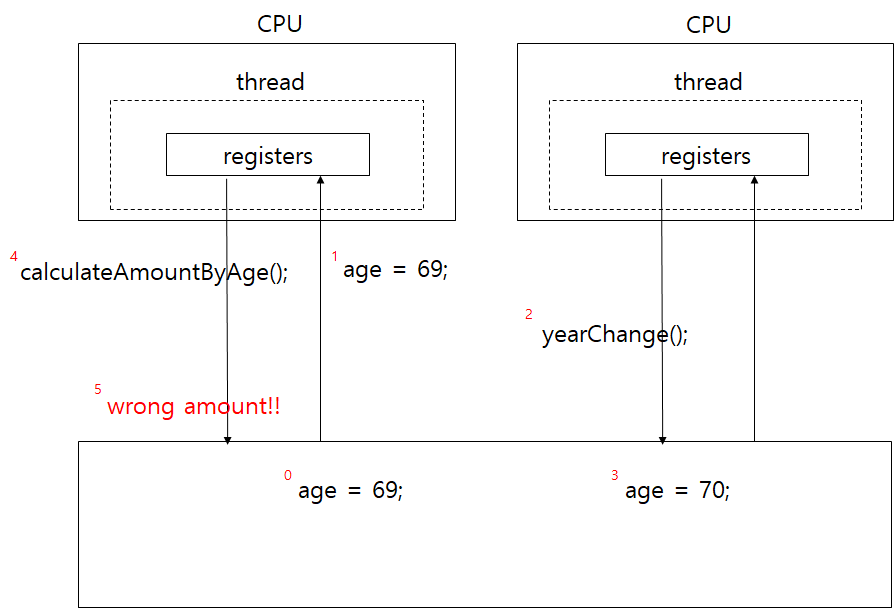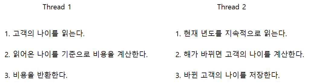 69세이신 고객이 계산을 진행할 때 첫 번째 스레드에서는 Ram에서 나이가 69세임을 가져와 이를 철썩같이 믿고 나이에 따라 비용을 계산하는 메소드를 실행하려 한다. 마침 해가 딱 바뀌어 년 바뀜을 계산하는 두 번째 스레드에서 Ram에 해당 고객의 나이가 70세임을 수정한다.