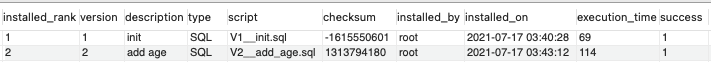 V1__init.sql과 V2__add_age.sql이 히스토리로 저장된 것을 확인할 수 있다.