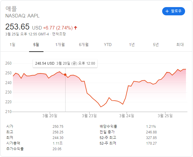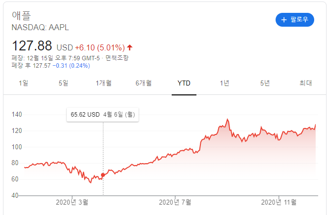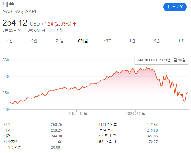 재테크라고 하긴 과하고, 적어도 용어나 종류, 방법은 알아야 할 것 같아서, 고민하다가 코로나 문제로 하락장일 때 사보자고 증권 계좌를 개설하고 차트 보는척 좀 해주다가 애플 1주 매입했다. 애플을 고른 이유는 1) 안 망할거 같아서 2) 꾸준히 상승세라 3) 내가 좋아하는 기업이라.