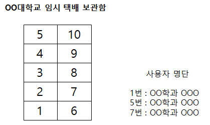 한 대학교에서 학생들의 편의를 위해 임시 배송지를 만들어 주고자 한다. 모든 학생에게 각각의 택배함을 배정하고 그 주소를 OO대학 OO과 OO학번 OOO으로 하였다.