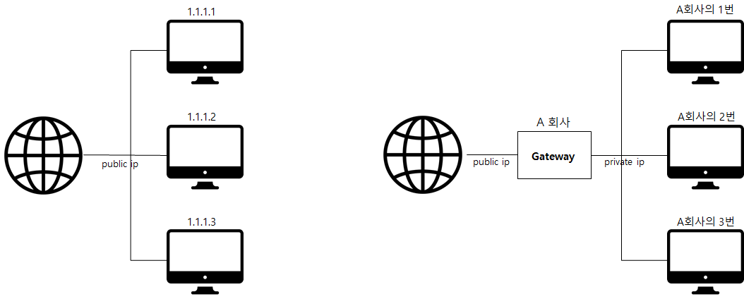 아래 그림처럼, NAT를 사용하기 전에는 모든 사원의 PC에 공인 IP 주소를 할당해야 했지만, NAT 사용 후에는 변환기에서 이를 private IP로 변환해줘 변환기에만 공인 IP 주소가 할당되어 있으면 된다.