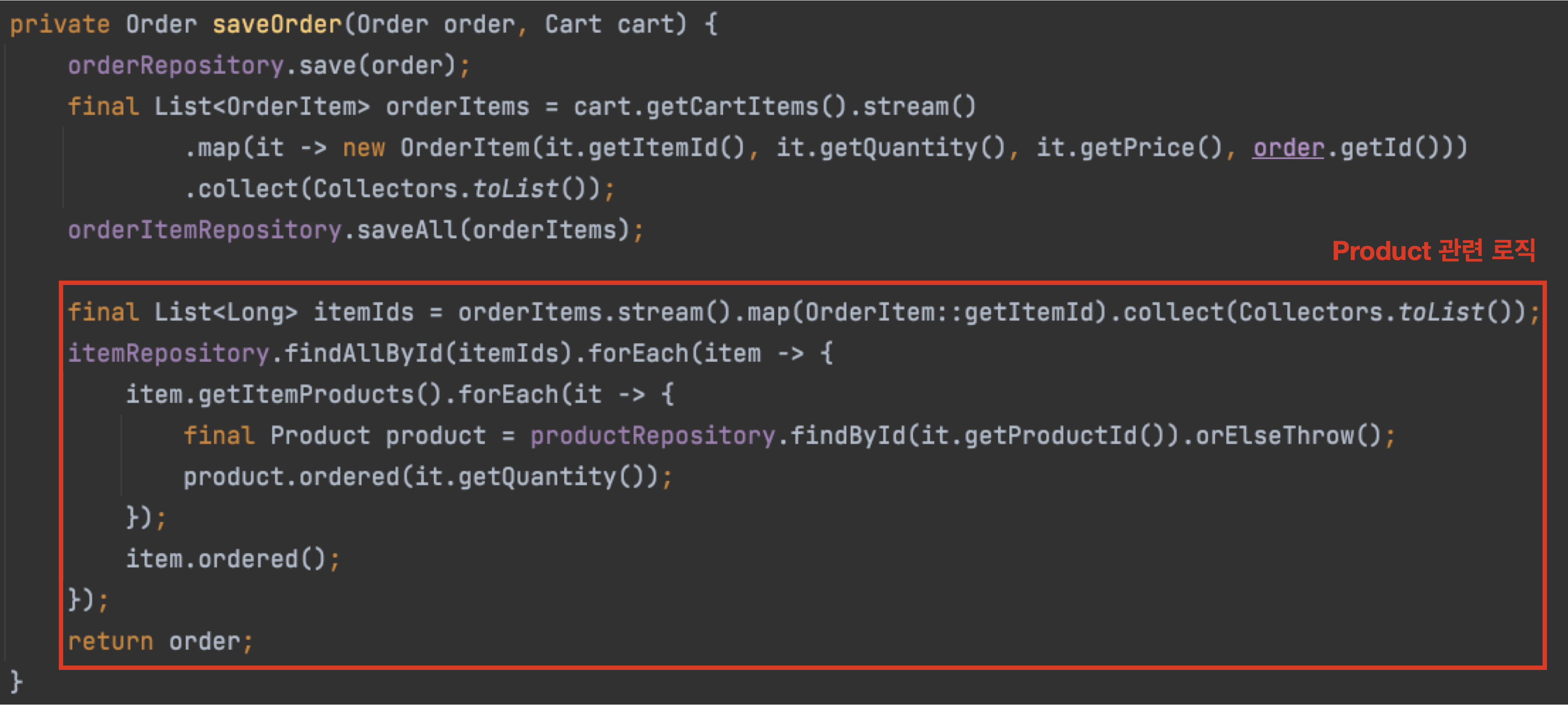 Product 코드 관련 로직이 추가되어 OrderService 코드가 복잡해지고, 관련 로직을 위한 테스트 코드를 작성하는데에도 더 많은 코드가 필요해졌다. OrderService와 테스트에서 집중해야 하는 주 역할이 아닌, Product에 관심이 뺏기고 있는 상황이었다.