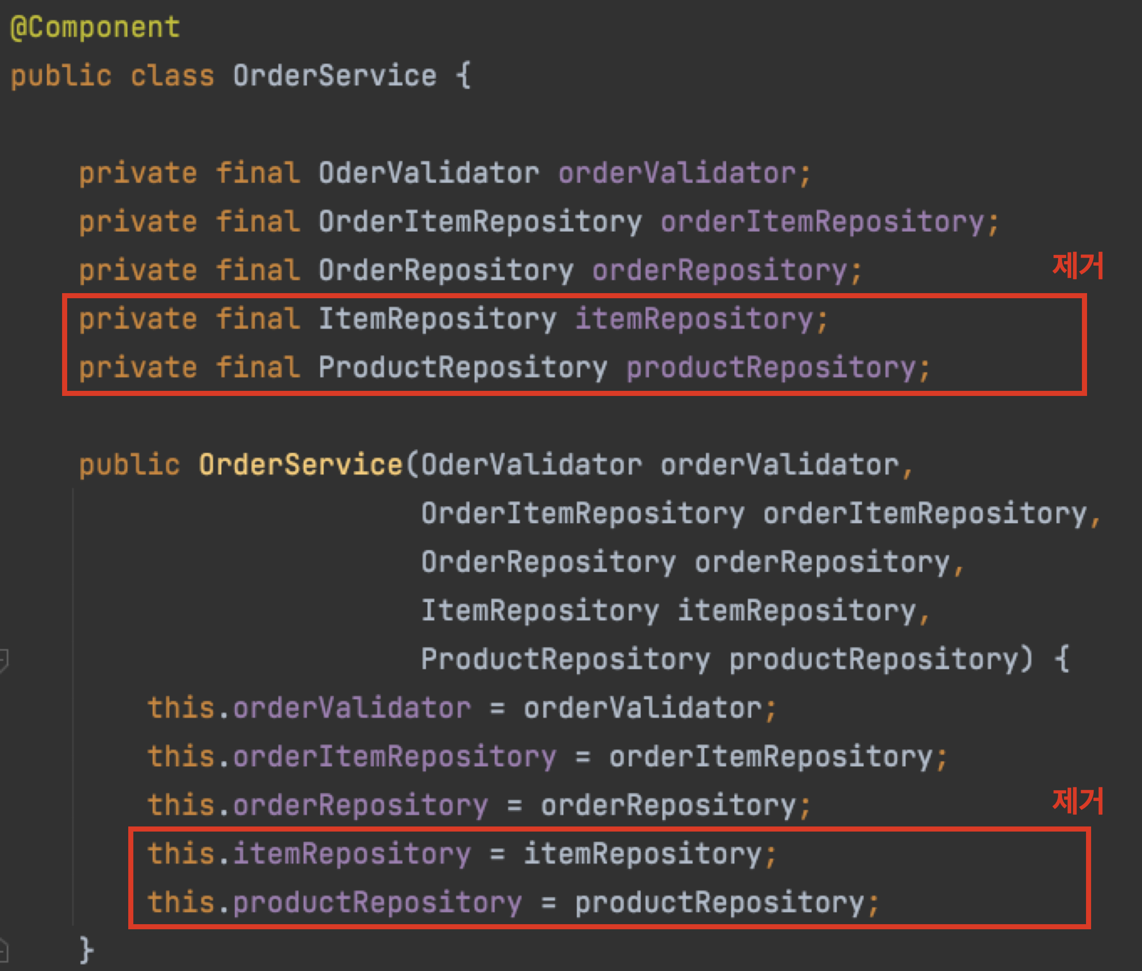 이 이전까지는 OrderService는 Product 관련 도메인을 분리해둔 상황이었다. 이번 요구 사항을 위해서 OrderService에 Product 관련 Repository 참고가, 더 크게 Order 패키지의 관점에서도 불필요했던 Product 패키지의 참조가 필요해졌다.