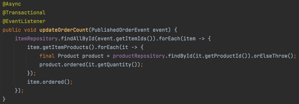 이때 이벤트를 처리하는 로직은 비동기로 처리하였다. 사용자의 상품 주문 요청을 처리하는 시나리오 (주문 -> 이벤트 발행 -> 응답)과 별개의 스레드로 이벤트를 처리하고 싶었다. 굳이 그 이벤트가 처리 완료되기까지 기다릴 필요가 없는 상황이기 때문이다.