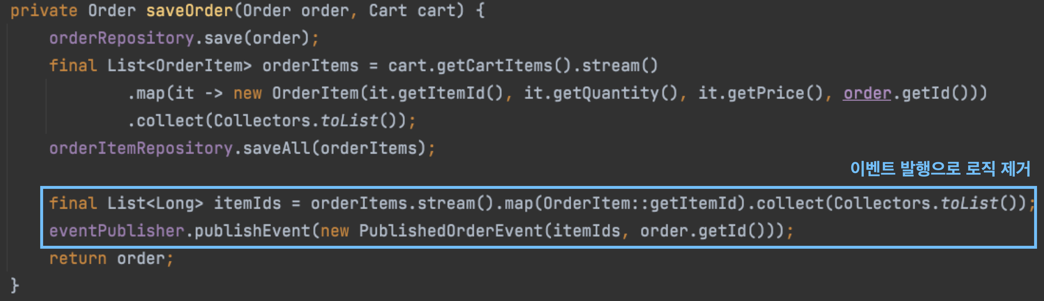 이런 상황안에서 Order과 Product를 분리하기 위해 이벤트 핸들링을 사용했다. OrderService에선 주문이 생성되는 이벤트를 발생시키고, 그 이후에 그 이벤트가 처리되는 과정은 관심 밖으로 하는 것이다.