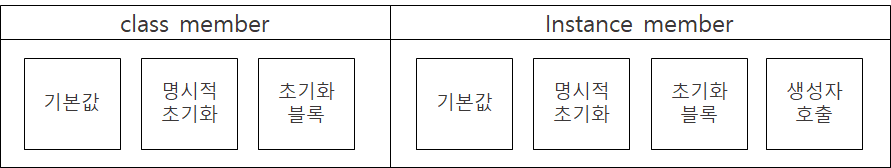 인스턴스 되면서, 인스턴스 멤버 역시 마찬가지로 기본 값에서 명시적 초기화, 초기화 블록에 의한 초기화가 수행되고, 그 후 생성자가 호출됨에 따라 생성자에 의한 초기화가 처리된다.