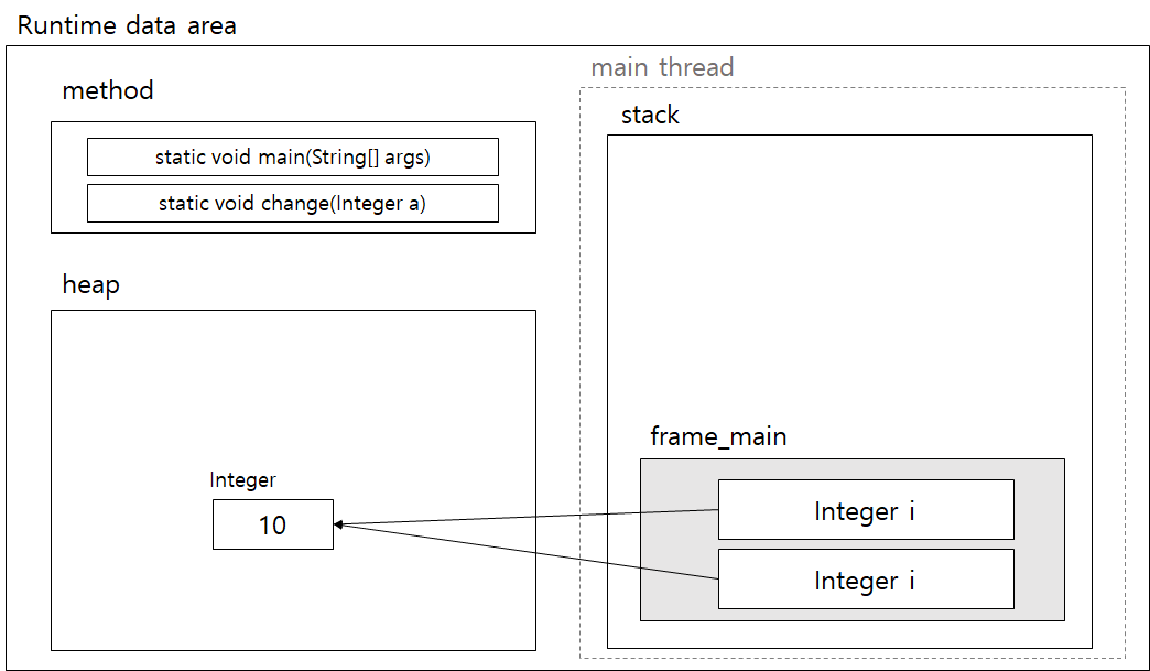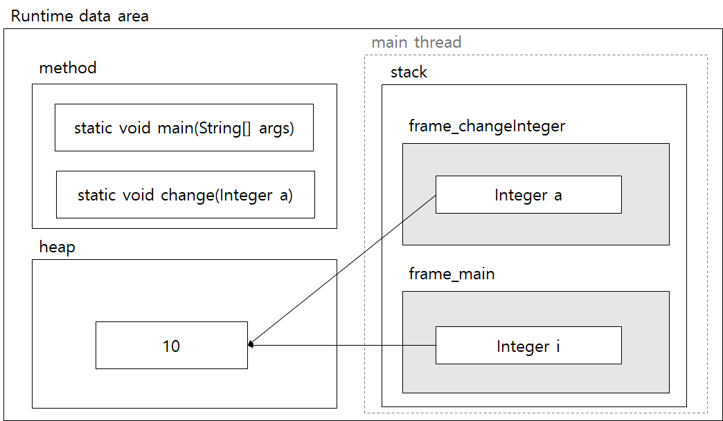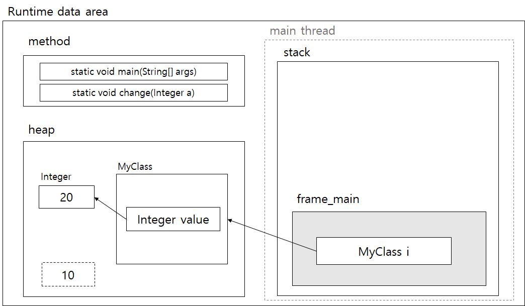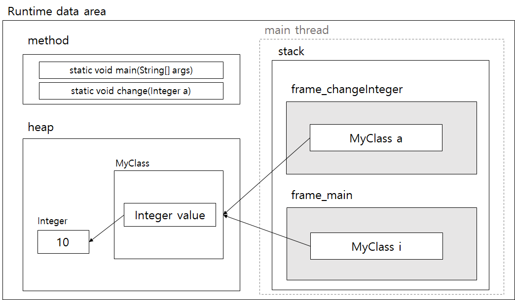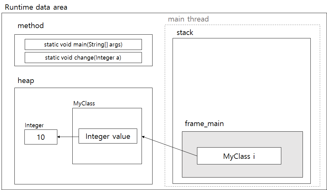 changeInteger가 호출되기 이전의 그림은 다음과 같다. MyClass 객체가 Heap에 생기고 frame_main의 i는 그 객체를 참조한다. MyClass 객체는 다시 value가 10인 Integer를 참조한다.