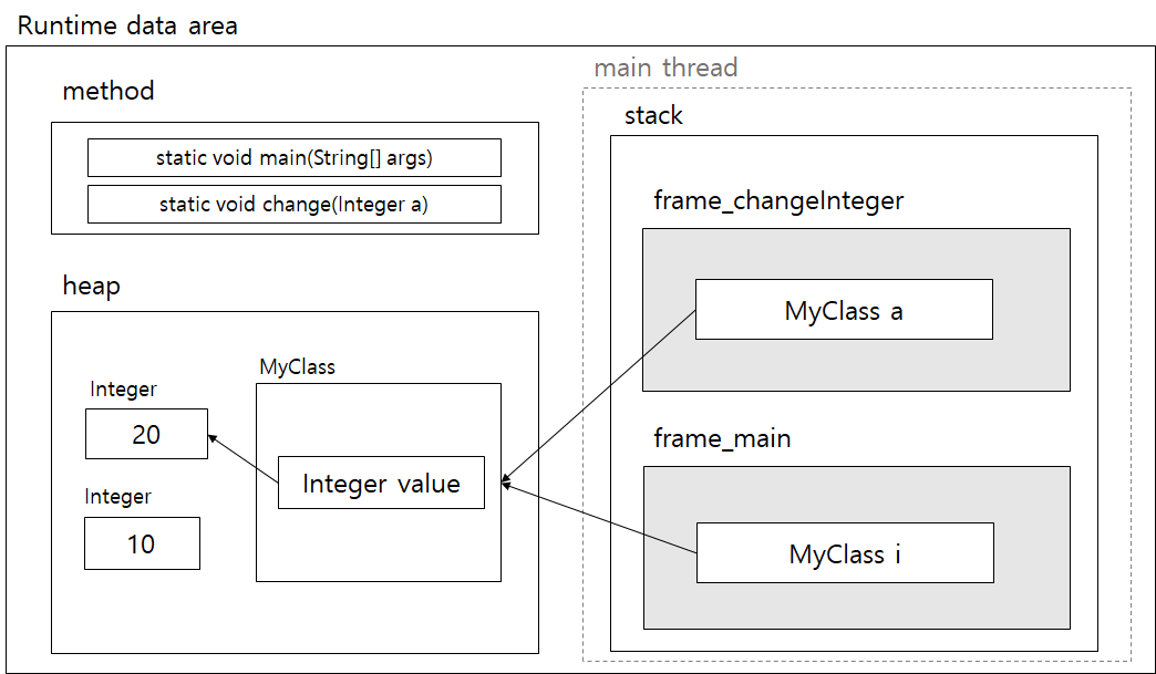 따라서 changeInteger 프레임이 종료되어도 i가 가리키고 있는 MyClass의 value 값은 20으로 고정되는 것이다.