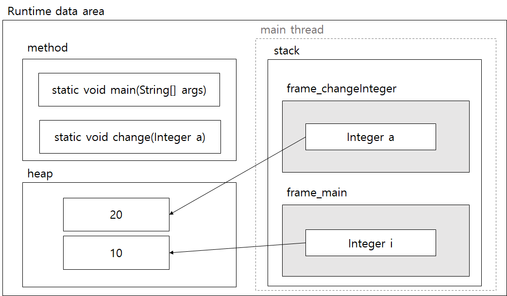 사실 아까 메모리 구조도 맞긴 맞지만 Integer a 에 20을 대입하는 부분이 빠졌다. 우선 changeInteger를 호출하면 Integer a = i으로, a가 heap 영역에서 value가 10인 Integer 객체를 같이 참조하는 것까지는 맞다.