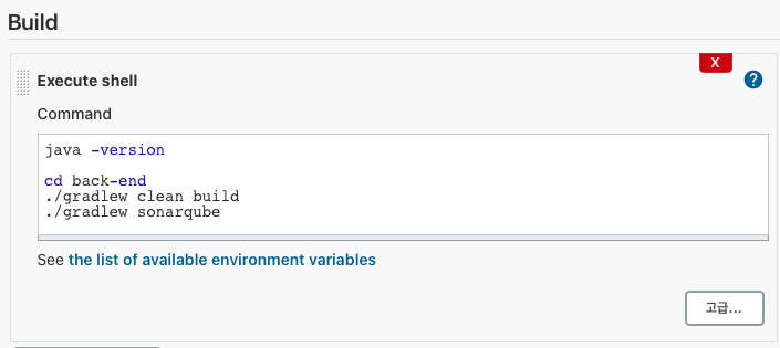 Build 을 찾고 Add build Step으로 Execute shell을 하나 추가하거나, 기존의 Execute shell에 java -version을 확인하는 명령어를 넣어주는 것이다.