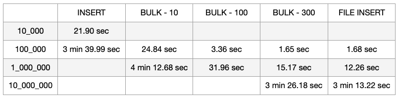 Application 내에서 데이터 삽입시 예상 시간이 1시간이 넘었고, DB에 직접 데이터를 넣는 방식으로 업로드 시간을 줄였다. 프로시저로 300개씩 Bulk insert 와 File insert 에 시간 차이는 크지 않았지만, CSV 파일을 만드는 코드를 짜는 것이 FK, Row 수 등 세부 설정과 코드 관리에 유리하다고 판단했다. 1시간 반을 예상했던 더미데이터 업로드가 3분 13초로 단축할 수 있었다.