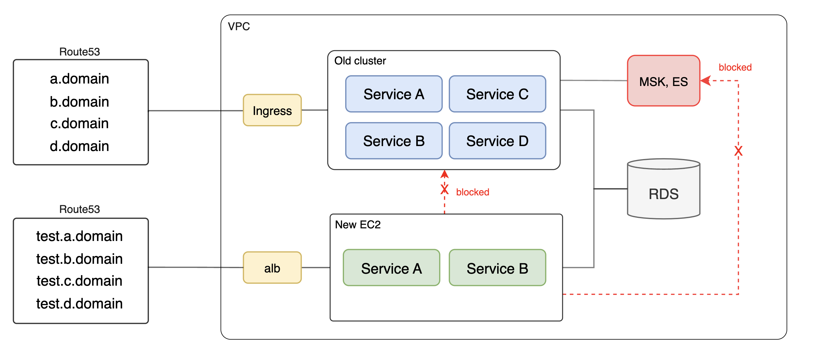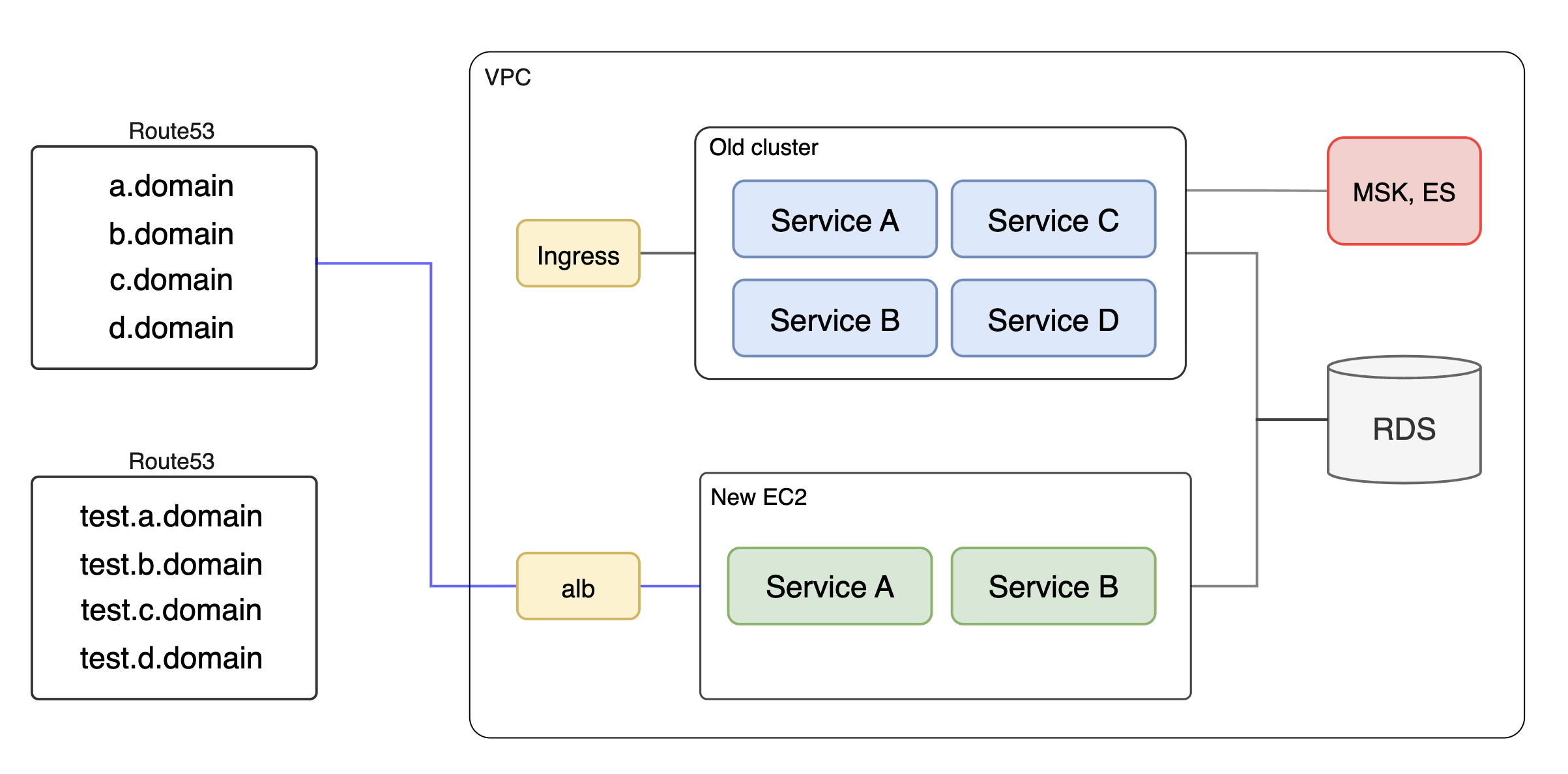 기존 Ingress(ALB)에 새로운 EC2를 엮는 것이 아니라, 아예 새로운 ALB를 따로 두고 테스트 도메인을 묶었다.