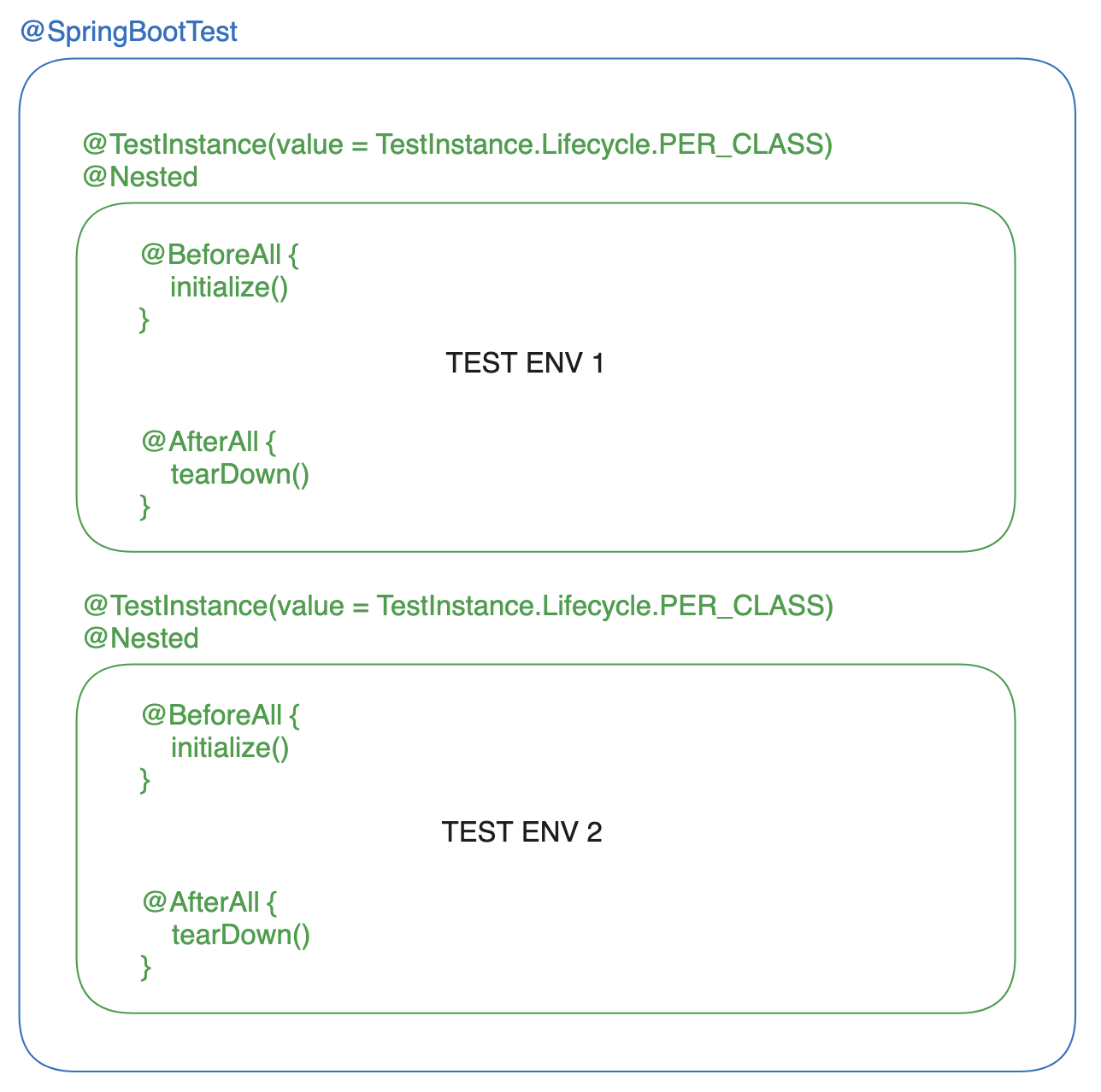 예를 들어 아래처럼 `@BeforeAll`, `@AfterAll` + static method 를 사용하거나,`@TestInstance(value = TestInstance.Lifecycle.PER_CLASS)` 으로 아예 테스트 생명 주기를 나눌 수도 있겠다.