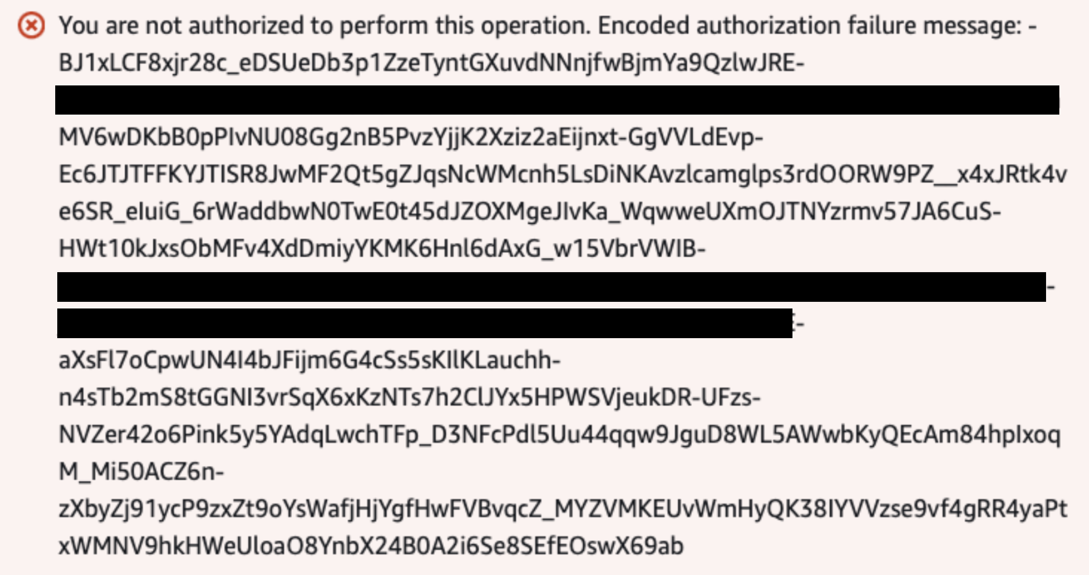 IAM policy로 리소스 제어에 제한이 생길 경우 다음처럼 에러 메시지가 암호화되어 출력된다.