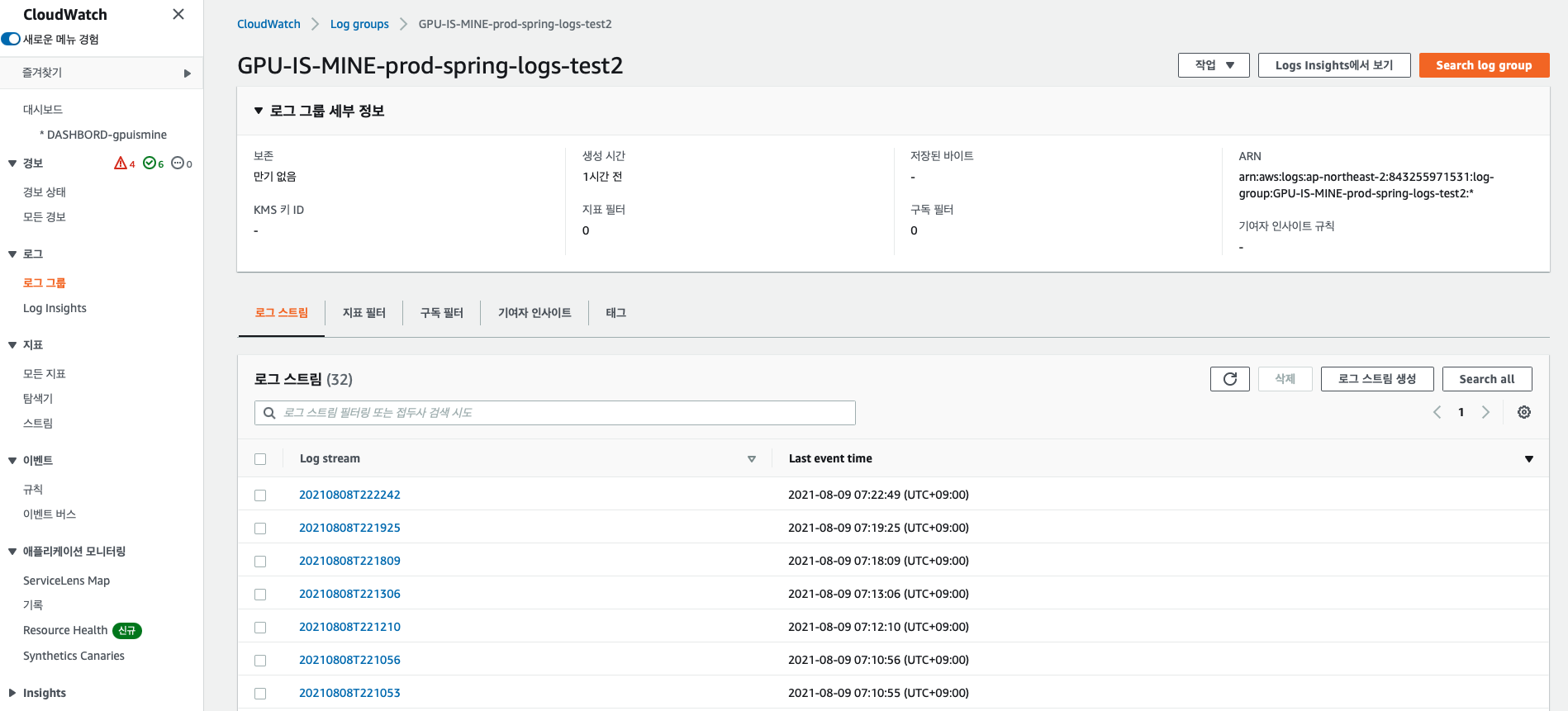 설정 파일에 작성한대로 cloudwatch 로그 그룹, 스트림 생성