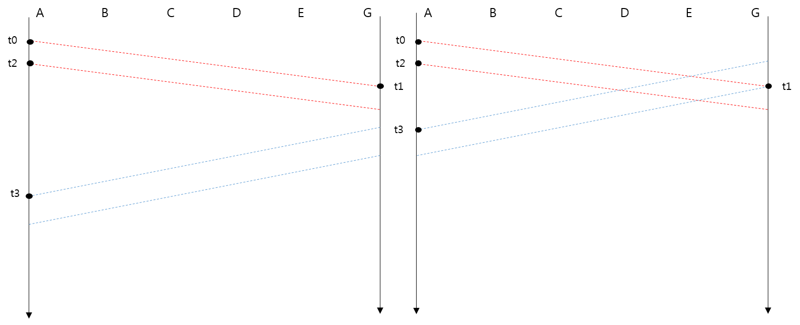 - 오른쪽 그림에서 A의 전송이, G에서 전송하여 t3에 도착하는 frame 보다도 더 먼저 (t2) 종료된다. A의 입장에서는 Collision이 발생하지 않은 왼쪽 상황이랑 다를게 없다. A의 전송 내용이 너무 짧아 Collision 여부를 채 확인 하지 못하는 것이다.