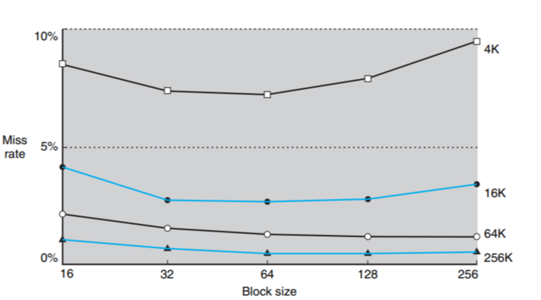 그렇다고 블록 사이즈가 캐시 성능에 비례하는 것은 아니다. 위 표는 블록 사이즈에 따른 Miss율을 보여준다. Block 사이즈가 커질 수록 한 index line에 포함되는 hit 데이터가 많아지니 일반적으로는 miss율이 낮아진다. 단, 한번 miss가 될 때 memory fetch 시간도 더 커지므로 이 실패 손실과 miss 율 감소를 비교해야한다. 또 블록 사이즈가 매우 크게 되면 블록 내 데이터들의 공간 지역성을 잃게 된다. 극적으로 블록 사이즈를 엄청 크게 키웠다고 가정해보자. 특정 block 사이즈 이상부터는 더 이상 '저장 공간이 가까운' 데이터라는 특성을 잃은 채 모든 데이터를 fetch하려 할 것이다. 이에 따라 miss율이 다시 증가하거나, 감소가 둔화되는 모습을 볼 수 있다.