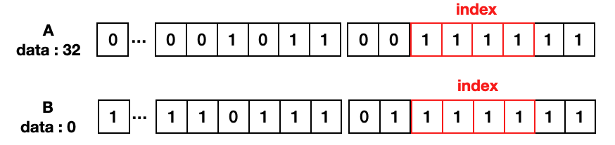 index의 위치를 주소에서 byteoffset 2비트를 제외한 하위 4비트로 예를 들면, A와 B 모두 index 값은 1111으로 캐시내 동일한 위치에 저장되게 된다. A를 저장된다고 하면 캐시의 index : 1111 라인에 A의 값 32가 저장되는 것이다.