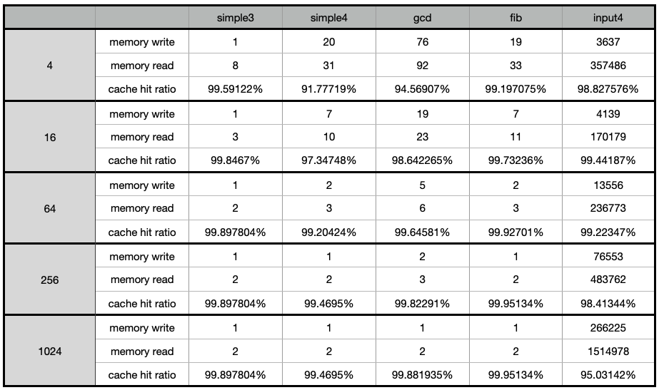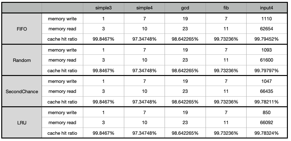 - Cache line : 4096 / blockSize, DirectMapped, Replacement strategy : FIFO, Write policy : write back
