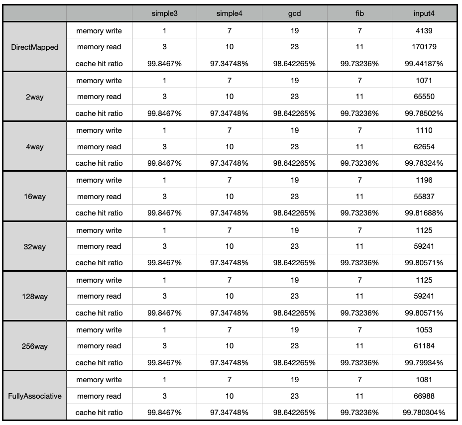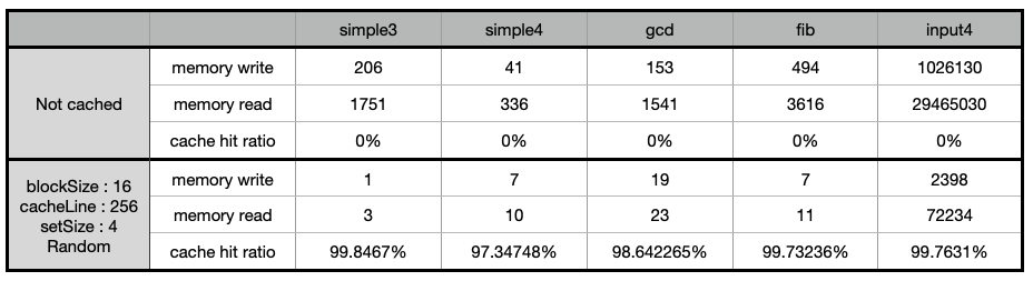 - Block size : 16, Cache line : 256, Set size : 4, Replacement strategy : Random, Write policy : write back