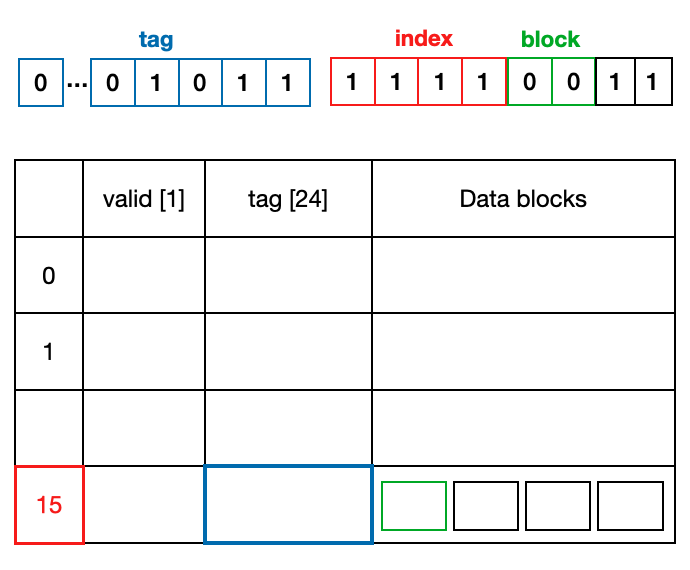 이렇게 Block으로 메모리 fetch, 캐시에 저장하게 되면, 앞선 예시의 index로 어떤 line을 확인할 것인지를 위해 index 값을 결정하고, 해당 라인의 어떤 block을 참조할 것인지 다시 확인해야 한다. 이를 위해 block 위치를 표시하기 위한 주소의 offset 비트를 정하고, 주소를 읽었을 때 해당 offset에 위치에 있는 데이터를 확인한다.