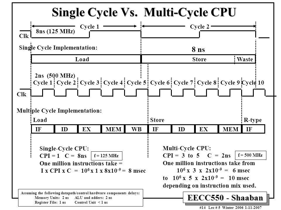 그렇다면 이런 Multi-cycle 방식에선 항상 더 효율적일까? 각 단계를 2ns, 1ns, 2ns, 2ns, 1ns 으로 가정하면, Single cycle에서는 클럭 주기가 8ns(2+1+2+2+1), Multi cycle에서는 2ns이다. 5단계를 모두 처리하는 Load에선 Single-cycle은 8ns, Multi-cycle은 10ns (2*5)가 소요된다. 게다가 Multi cycle에는 그림에는 포함되지 않은 스테이지를 저장하고 불러오기 위한 전환 시간도 존재한다. 이렇게만 봐선 Multi cycle이 더 비효율적인 것처럼 보이지만, 3단계까지만 수행하는 연산의 경우에는 Single cycle은 똑같이 8ns, Multi cycle의 경우는 6ns(2+2+2)으로 Multi cycle이 더 효율적이다.