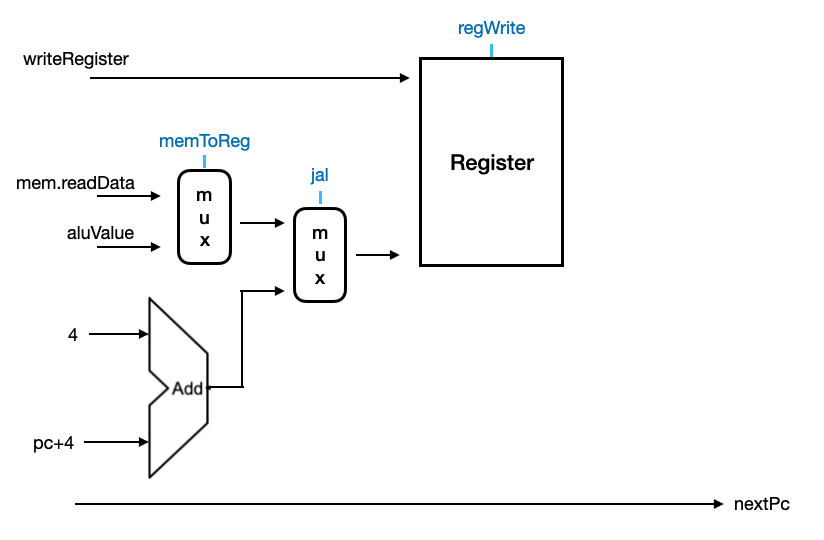 마지막 writeBack 단계에선 명령어의 처리 결과를 레지스터에 쓴다. 마찬가지로 ControlSignal과 mux로 입력 데이터 중 어떤 값이 쓰일 데이터인지 선택하고, ControlSignal.regWrite 여부에 따라 값이 기록된다.