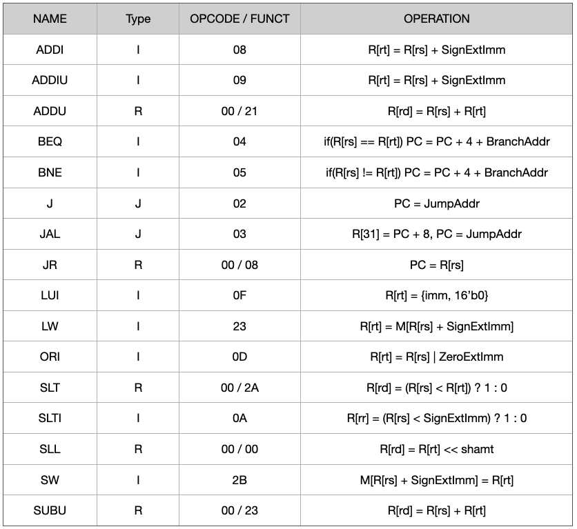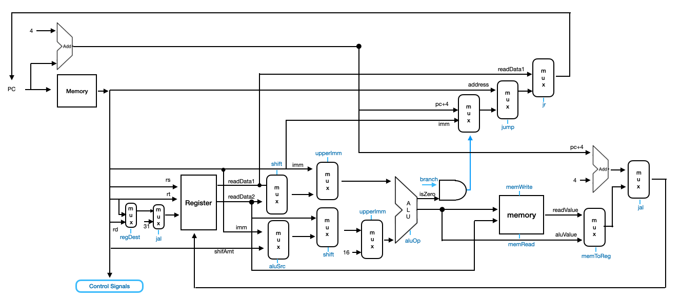 명령어 종류에 따라 연산에 사용되는 인자를 달리하기 위해 다음과 같은 Control signal을 정의하였다. 이를 Mux의 시그널로 이용하여 다음 처리의 인자를 선택하거나, ALU의 연산 종류(더하기, 빼기, Shitf 등..)을 결정하게 된다.