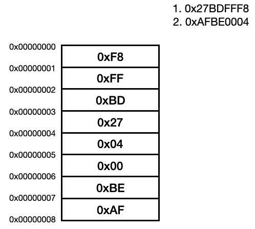 리틀 엔디안 방식으로 데이터를 읽고 썼다. 0x27BDFFF8, 0xAFBE0004 두 명령어가 차례로 저장된다면 메모리에 다음과 같이 저장된다. 명령어가 아닌 정수 데이터를 읽고 쓸 때도 4 바이트로 나눠 값을 저장하고, 4개의 주소에 접근하여 나눠진 값을 합쳐 값을 읽는다.