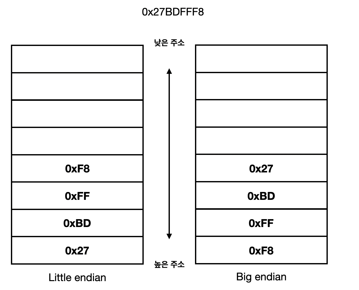 예를 들어, 한 명령어 길이가 32비트인 Mips의 명령어 0x27BDFFF8를 다룬다고 한다면 이를 0x27, 0xBD, 0xFF, 0xF8로 바이트씩 4개로 나눠 메모리에 쓰고 읽을 수 있다. 이때 그 값을 메모리(또는 배열)의 높은 주소부터 접근하는지(읽고 쓰는지), 낮은 주소부터 접근하는지 그 순서에 따라 빅 엔디안, 리틀 엔디안으로 나눌 수 있다. 빅 엔디언은 큰 단위가 앞에 오고, 리틀 엔디언은 작은 단위가 앞에 오게 된다.