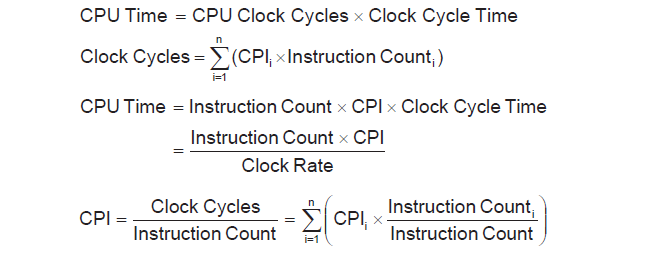 그렇기에 Cpu Time은 클럭 주기와 프로그램이 처리되기 위한 클럭 수가 결정한다. 이는 프로그램을 처리하는 데 사용되는 클럭 사이클의 수 * 클럭 사이클의 시간으로 계산할 수 있다. Cpu time을 줄이려면 클럭 사이클 수를 줄이거나, 클럭 주기를 줄여야 할 것이다. 프로그램 클럭 사이클 수 = 명령어 수 * 명령어당 평균적으로 사용되는 클럭 사이클 수로 계산할 수 있다. 마찬가지로 명령어 수를 줄이거나, 명령어 당 평균적으로 사용되는 클럭 사이클 수(Cycles Per Instruction)를 줄이는 것으로 Cpu time을 줄일 수 있다.