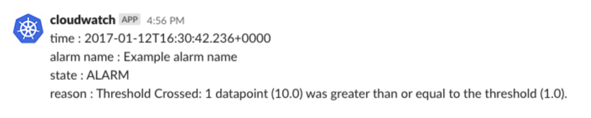 "Message": "{\"AlarmName\":\"Example alarm name\",\"AlarmDescription\":\"Example alarm description.\",\"AWSAccountId\":\"000000000000\",\"NewStateValue\":\"ALARM\",\"NewStateReason\":\"Threshold Crossed: 1 datapoint (10.0) was greater than or equal to the threshold (1.0).\",\"StateChangeTime\":\"2017-01-12T16:30:42.236+0000\",\"Region\":\"EU - Ireland\",\"OldStateValue\":\"OK\",\"Trigger\":{\"MetricName\":\"DeliveryErrors\",\"Namespace\":\"ExampleNamespace\",\"Statistic\":\"SUM\",\"Unit\":null,\"Dimensions\":[],\"Period\":300,\"EvaluationPeriods\":1,\"ComparisonOperator\":\"GreaterThanOrEqualToThreshold\",\"Threshold\":1.0}}",
