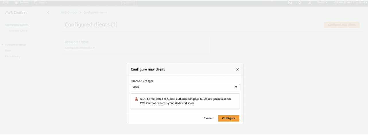 AWS chatbot → Configure new client으로 슬랙을 선택한다.