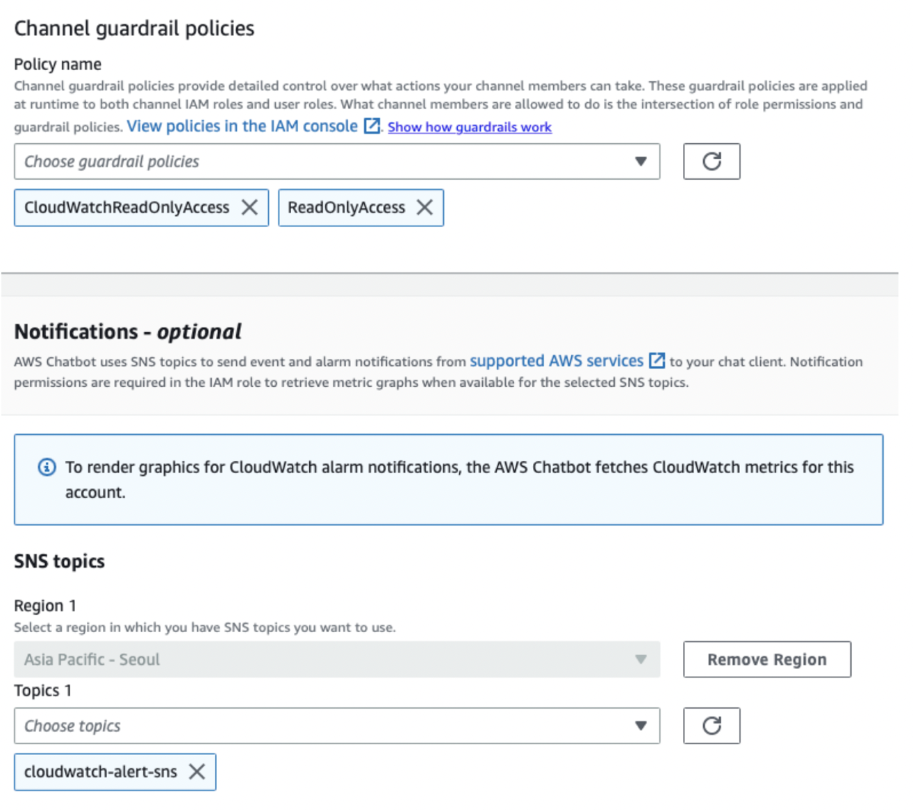슬랙의 AWS chatbot plugin을 사용하여 채널 정보와 cloudwatch alarm을 묶은 topic 정보를 입력한다. 이때 Channel guardrail policies에 cloudwatchReadOnlyAccess를 추가해야 한다.
