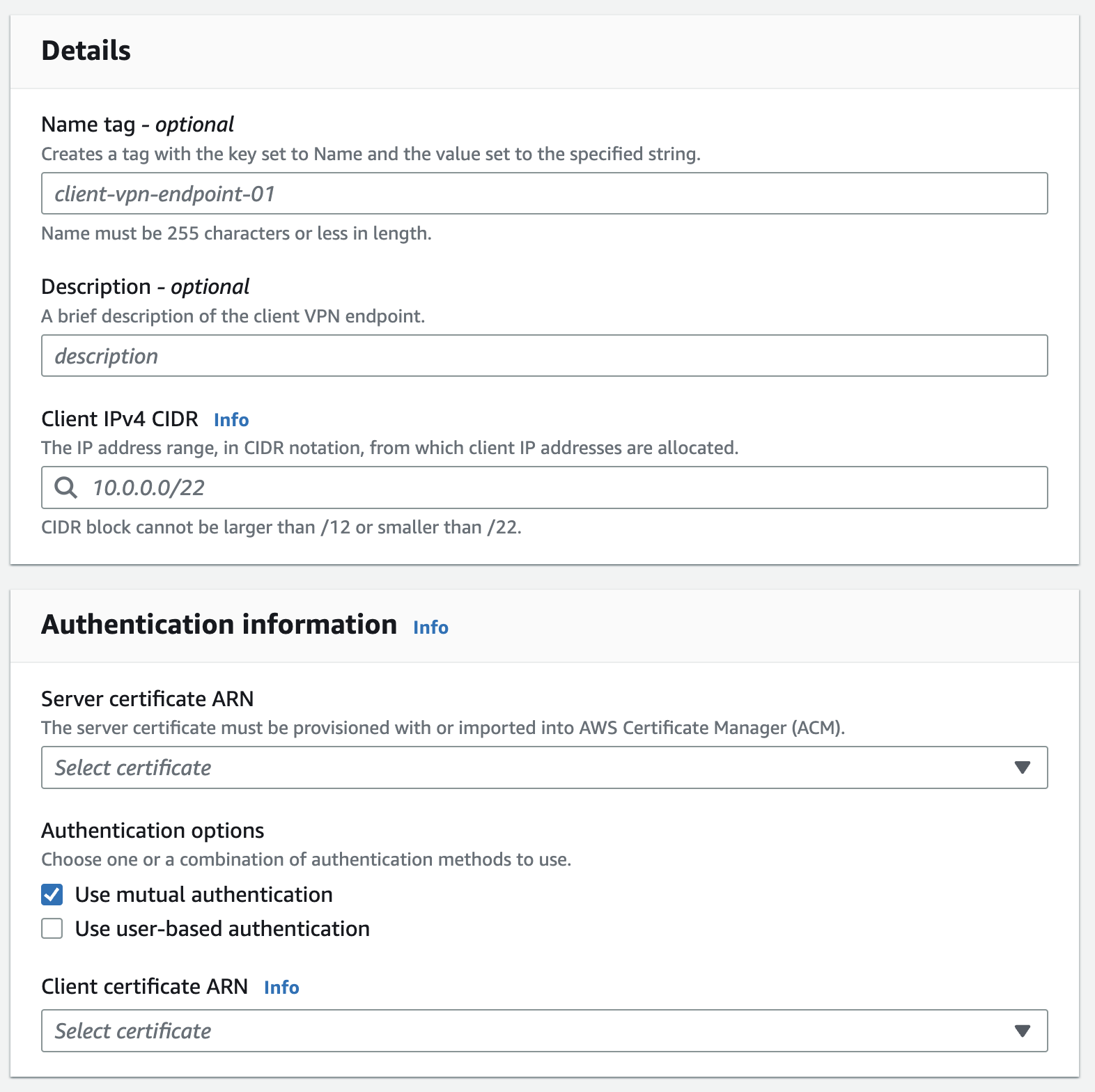 3-1. 'Use mutual authentication'을 선택하고 Client IP 범위 (Cluster endpoint ip range), server certificate ARN과 client certificate ARN에 생성한 cert 정보를 각각 선택한다.