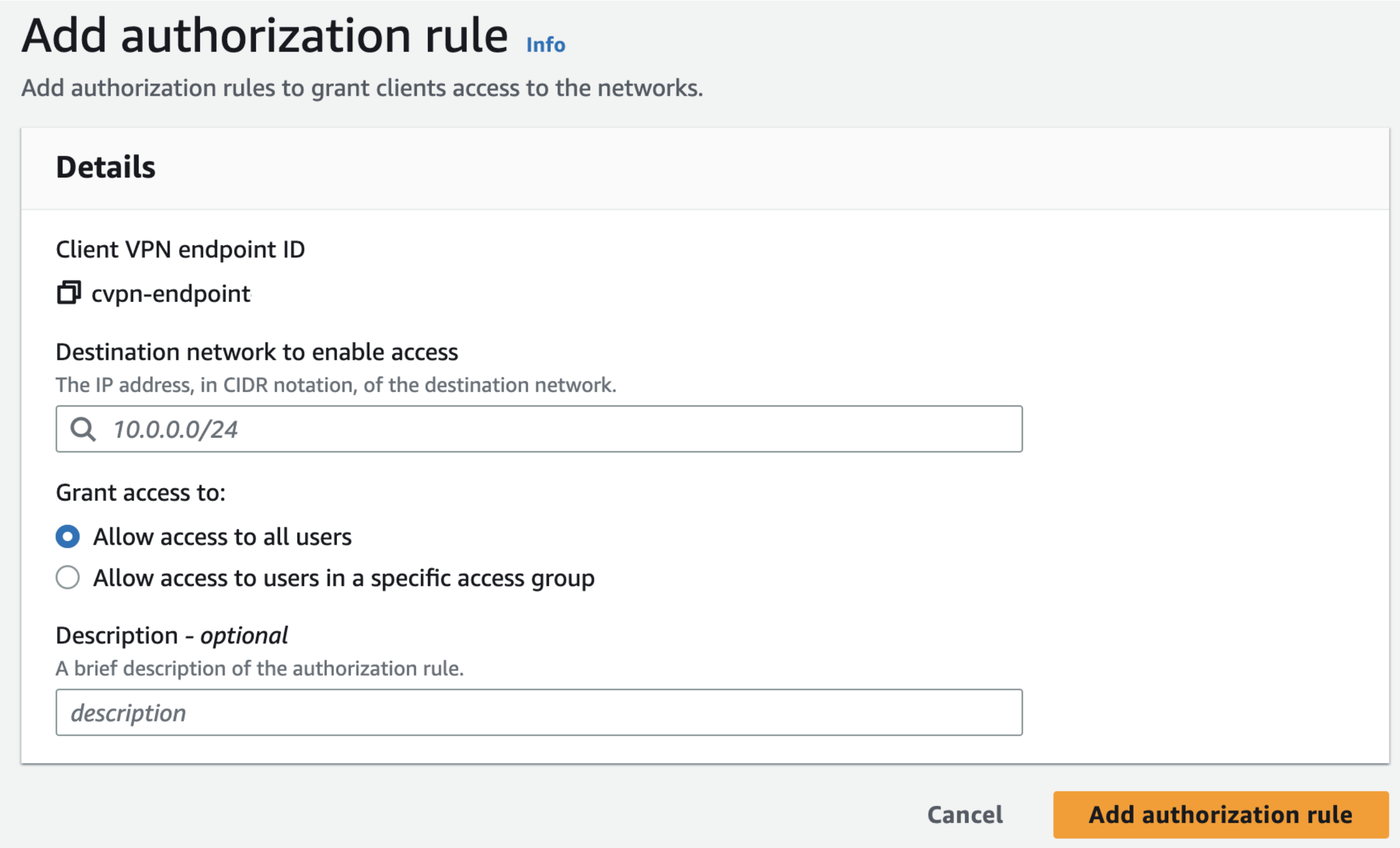 3-3 Authorization rule 추가 -> Destination endpoint로 VPC CIDR를 입력한다.