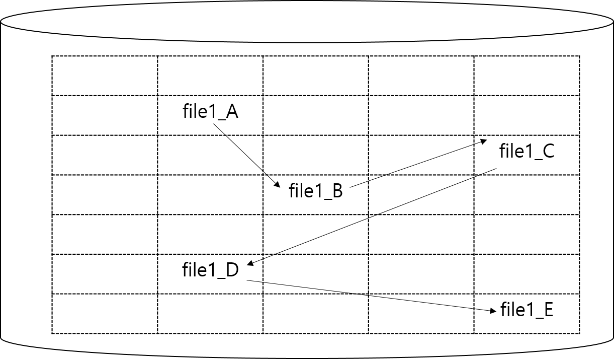 - 연속 할당 방식은 말그래도 블록을 순서대로 사용해서 파일을 저장한다. 디스크 이동을 최소화할 수 있어 속도가 빠르고, 원하는 특정 위치를 직접 읽을 수 있다.