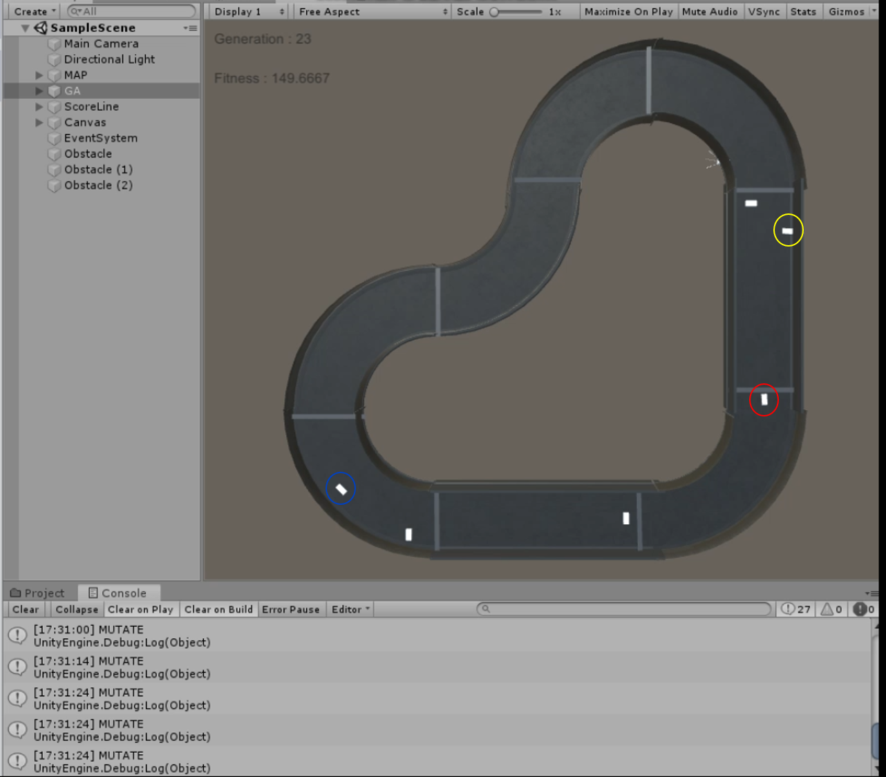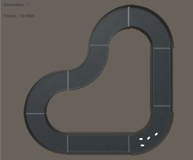 학습은 잘된다. 처음에는 센서에 벽면이 검출되면, 랜덤하게 회전하여 나아가지도 못했던 자동차들이 완주에 성공하고, 그 이후로는 더 빠르게 완주할 수 있는 자동차가 우수한 염색체로 선택되어 점점 빠른 주행이 가능하도록 발전한다. 돌연변이가 없는 한 모든 자동차가 결국 하나의 염색체로 통일된다.