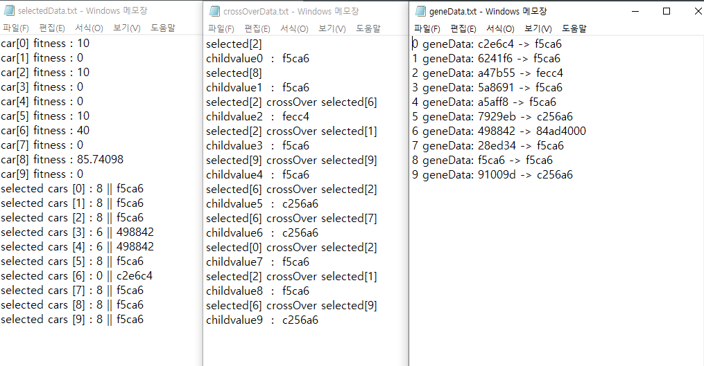학습이 잘 진행되고 있는지 확인하기 위해 염색체의 적합도, 선택된 염색체, 교배 상황, 부모 염색체와 자식 염색체를 기록하였다.