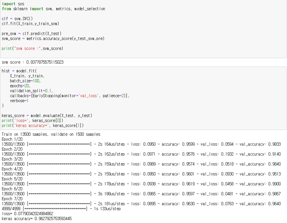 - svm의 정확도는 93.7, keras는 92~96의 정확도를 가진다. 아직 케라스를 사용하는 법만 알지 개념을 제대로 공부하지 않아, svm과 keras가 어떤 상황에서 각각 유리한지 모르겠다.