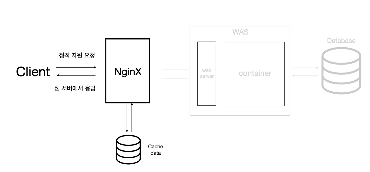 WAS 전면에 분리된 web server에서 정적인 자료를 캐싱하여, 전면 web server에서 빠르게 처리해주는 것으로 WAS의 부담을 줄일 수 있다. 앞서 말한 것처럼 웹 요청에서 정적 자원을 요청하는 경우는 상당히 많으므로, 로직이나 DB 액세스가 불필요한 요청을 WAS에서 처리하는 것이 아니라, WAS에 도달 전 web server에서 캐싱된 자료를 이용하는 것만으로도 상당히 큰 성능 개선이 가능하다.