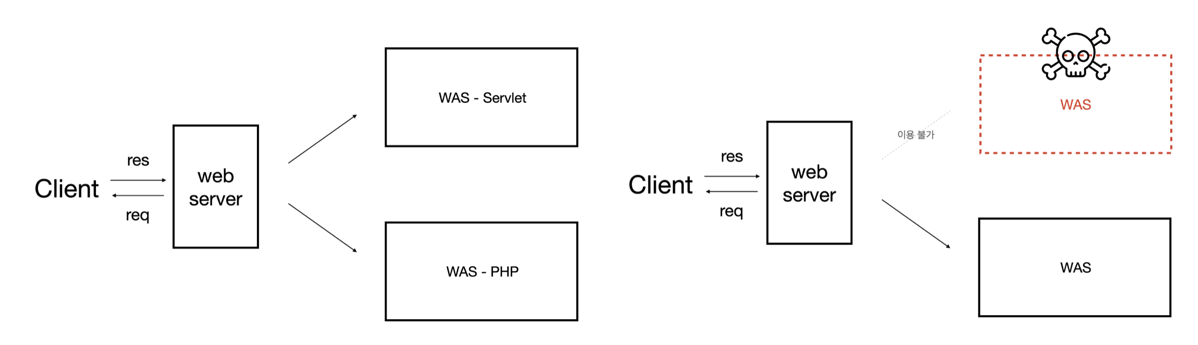 이는 꼭 web server가 요청을 여러 WAS에 분산하는 로드 밸런싱을 말하는 것이 아니다. 부하 분산이 없는, 요청이 웹 서버에서 한 WAS만으로 넘어가는 구조라 하더라도, WAS를 쉽게 변경 가능함은 WAS를 유연하게 교체할 수 있다는 큰 이점을 얻는다.