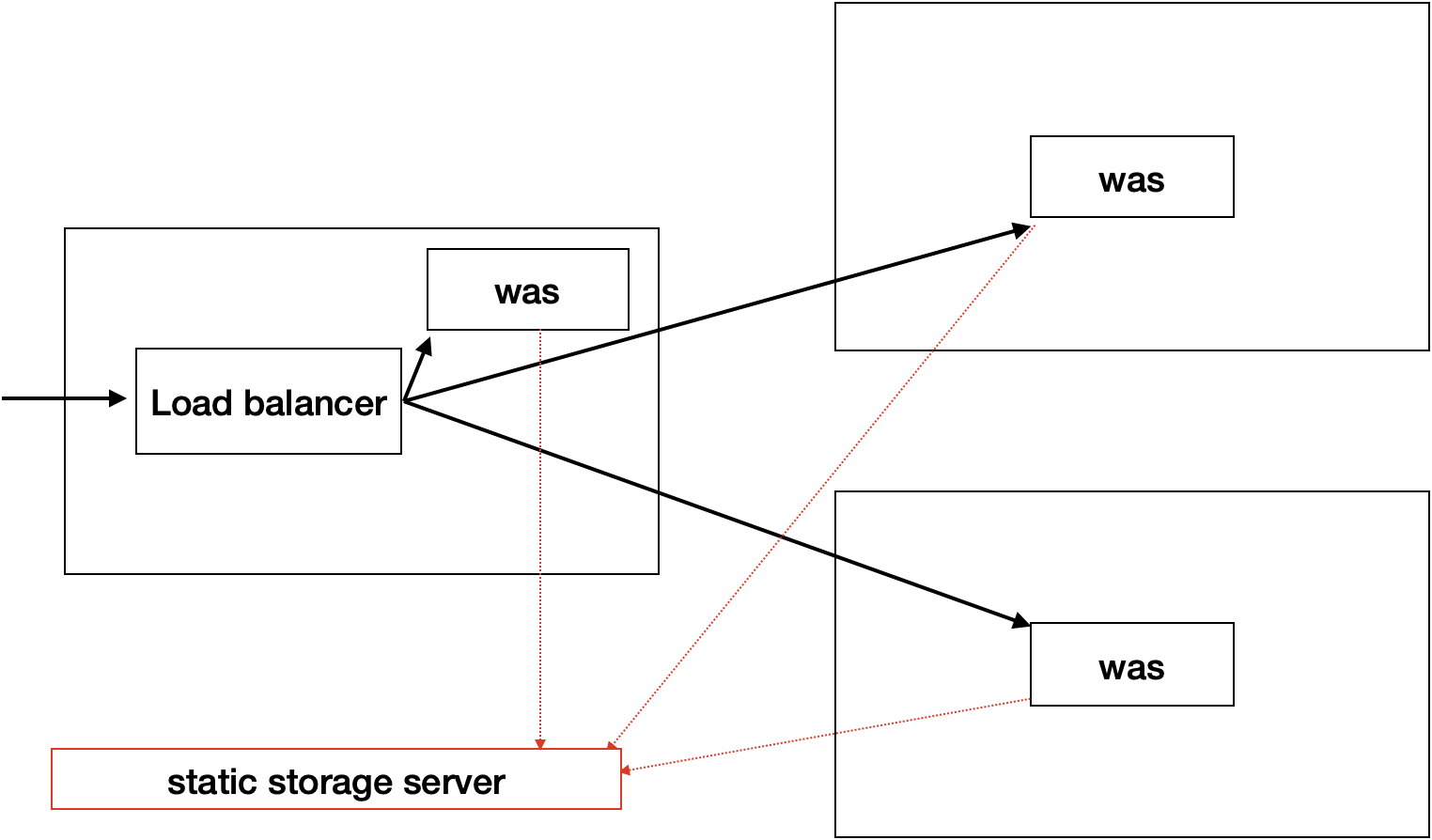 혹은 아래 그림처럼 각 WAS가 요청 처리 과정에서 외부 스토리지 서버에 새로운 요청을 만들고, 응답 받아 필요한 이미지 파일을 얻은 후에 최종 응답하는 구조를 만들 수도 있다.