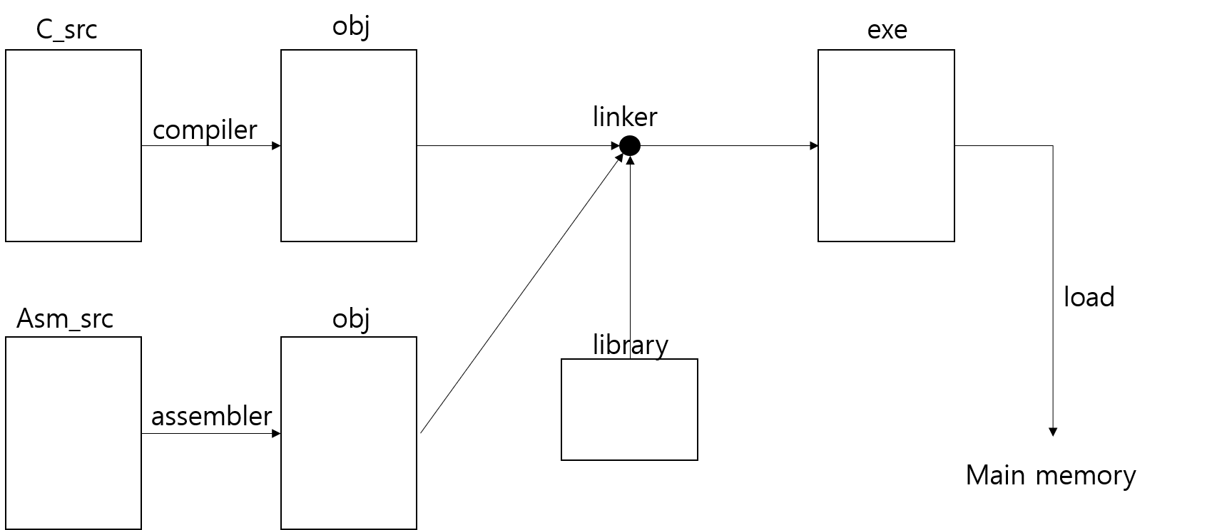- Dynamic linking (shared library) : 공통된 라이브러리가 오브젝트 파일에서 중복 적재되는 것을 막기위해, 라이브러리 루틴의 링킹을 실행 시까지 미뤄, 이를 다 올리지 않고 common library 하나만 적재하는 것으로 한다.