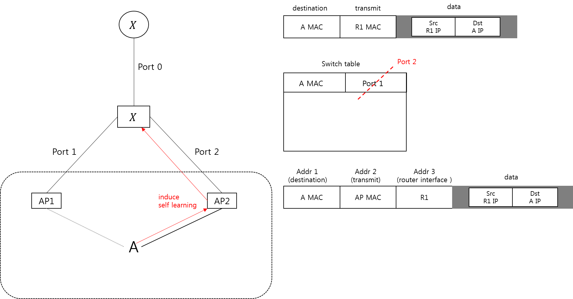 - 같은 네트워크 안에서 AP가 바뀐 A_host 가 ip/port를 이전과 같이해서 Router X의 프레임을 받게 하고 싶다. 라우터 입장에서 스위치는 의미가 없는 매개체로 여기므로, A가 AP1 ->AP2 이어도 DHCP로 할당 받은 ip와 port가 바뀌지 않는다.