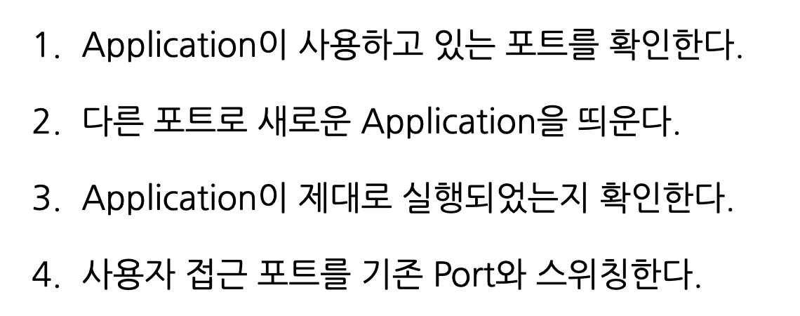 이전 버전의 Application 프로세스를 죽이지 않은 상태에서, 새로운 버전에 버그가 발견된다면 앞선 4번의 내용처럼, nginx의 포워딩 위치만 수정하는 것으로 빠르게 이전 버전의 Application으로 사용자 요청 처리를 돌릴 수 있다.